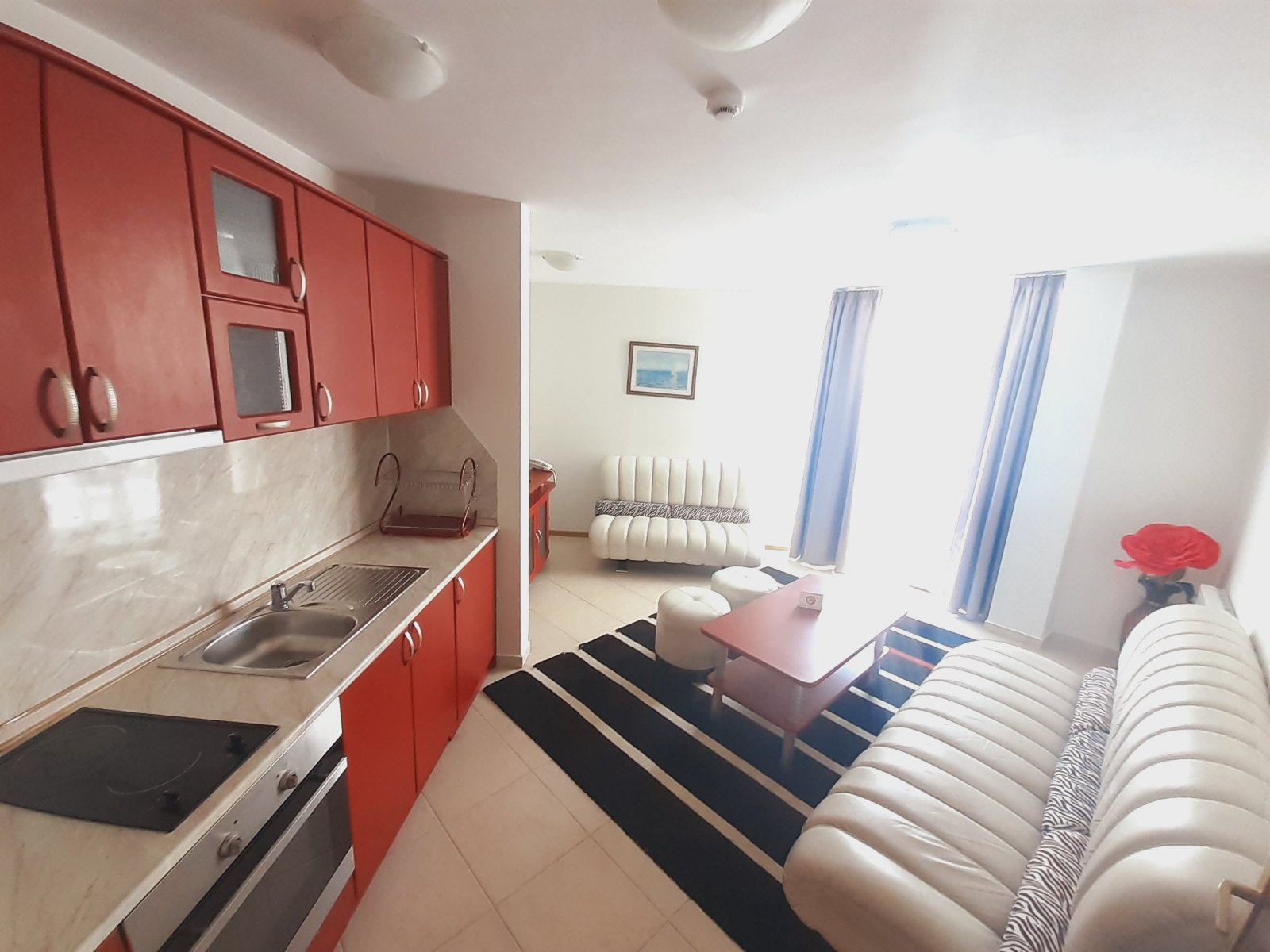 The two-bedroom apartment is facing southwest, with a total area of 97.20 sq.m. for 6 people and consists of a spacious living room with kitchen and dining area, two bedrooms, spacious bathroom with shower, toilet with sink and terrace. The kitchenette is fully equipped with all necessary appliances. Bedrooms without transition: one has a double bed, wardrobe and TV, and the other has two single beds, bedside tables and wardrobe.