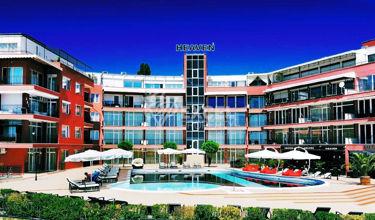 We offer to your attention a unique apartment with no analogues on the market in the area! The property is on the second floor of the "Heaven" complex in Sunny Beach, located on the beach itself. The apartment has a total area of 85 sq.m. and consists of a spacious living room with a kitchen equipped with everything you need, a bathroom, a large furnished bedroom with its own bathroom and a terrace. Great panoramic view of the beach, the sea and old Nessebar. The building has Act 16, household electricity, the maintenance fee is 15 Euro/sq.m