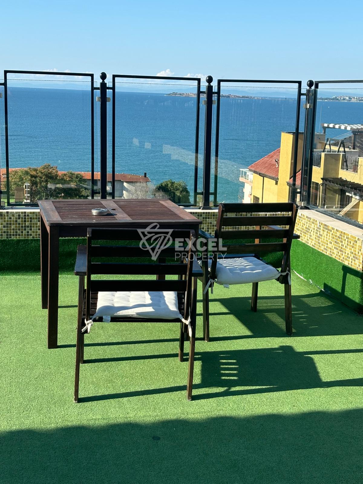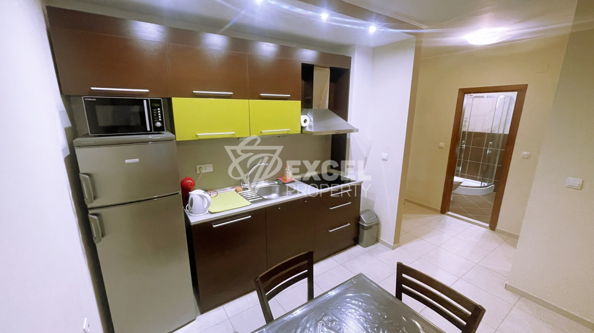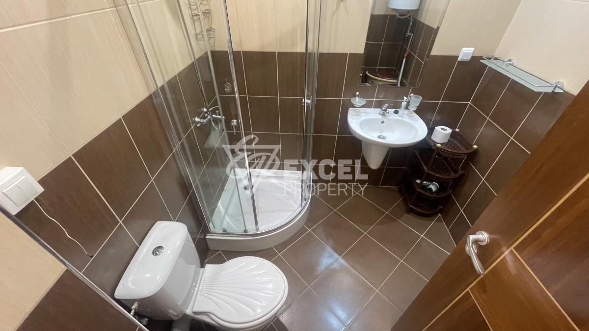 Excel Property offers for sale a two-bedroom apartment in the Marina Park complex. The property is bright and sunny, located on the second floor and has a total area of 60 sq.m. It is offered fully furnished and consists of an entrance hall, a living room with a kitchenette, a bedroom, a bathroom and a balcony. The vestibule is equipped with a portmanteau with a mirror, in the living room there is a kitchenette with an oven, hobs, hood, washing machine, refrigerator, sofa bed, dining table with four chairs and TV set. In the bedroom you will find a double bed with bedside tables, a wardrobe and a second TV. The bathroom is equipped with a shower cabin, one air conditioner is available. The terrace is large in size, faces east and is equipped with a table with chairs and two chaise lounges. The property offers an excellent rental opportunity, as it can comfortably accommodate four people.