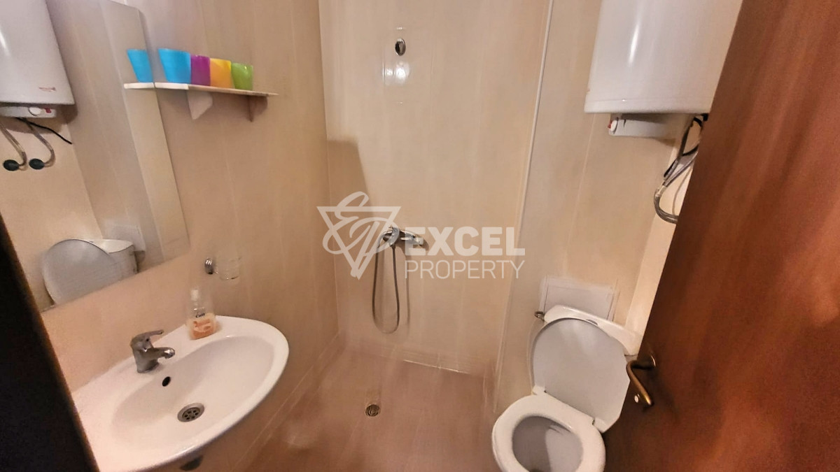 It consists of an entrance hall, a sofa bed and a double bed, a built-in kitchen with the necessary appliances and an equipped bathroom with a water heater, shower, mirror and WC. It offers a view of the green area of the complex, the property does not have a terrace. An ideal offer for your summer vacation or all year living. The studio is cozy and has air conditioning and space for personal belongings, a new washing machine, hood, electric stove, refrigerator, microwave.