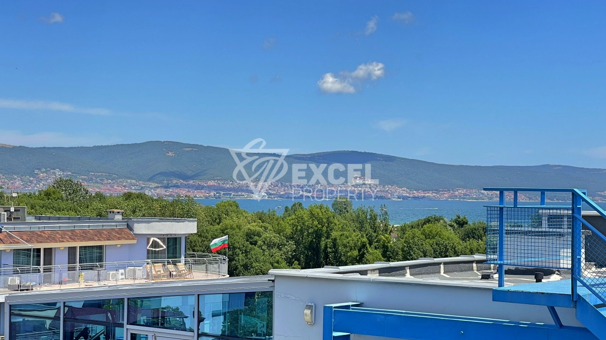 Excel Property offers for sale a furnished studio in Rainbow complex just 200 m from the sea. The property is bright and sunny, located on the sixth(from seven) floor and has a total area of 45 sq.m. The apartment is offered for sale fully furnished and has a living room with a kitchenette, a bathroom with a shower cabin and a balcony that has been glazed with construction as second room. The property has been used very little, is not rented out and all the furniture are new. The living room has a comfortable kitchenette with hotplates, a refrigerator and a washing machine. A double bed, wardrobe and sofa bed are also available. The bathroom is fully equipped, air conditioning is also available. The balcony is quite large and is currently equipped with a sofa bed and chest of drawers and is organized as a separate room. The terrace is equipped with blinds and offers a wonderful view of the sea. The maintenance fee is 12 Euro/m2, the property has AKT 16.