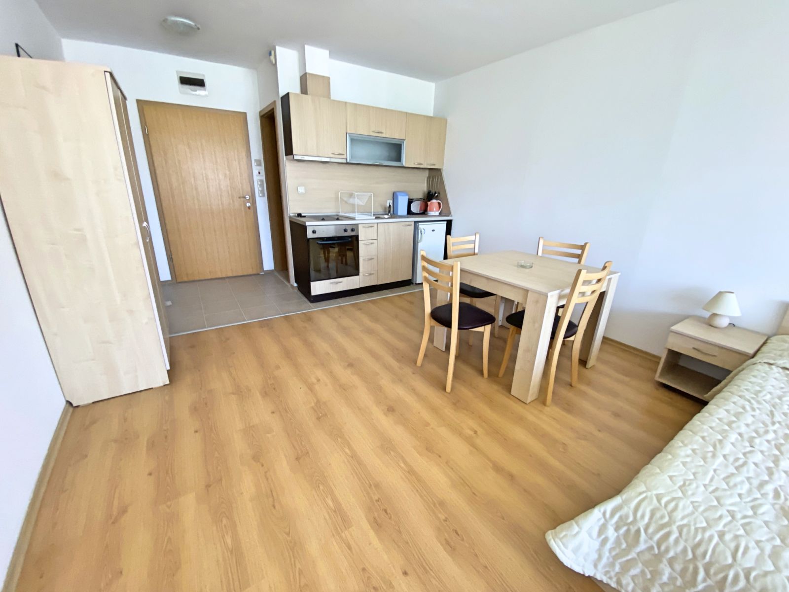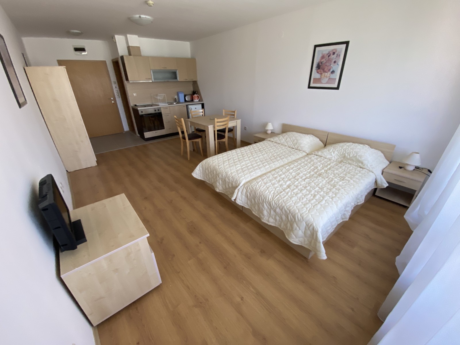 The distribution includes: entrance hall, living room, equipped kitchenette – built-in stove, hotplates, refrigerator, sink, hood; living area – table with four chairs, wardrobe; sleeping area – double bed with two bedside tables and TV. Toilet with bathroom with bathtub. Heating is with electric radiators. The property is finished with walls – latex, floor – laminate and terracotta and PVC joinery. There is an elevator in the building.
