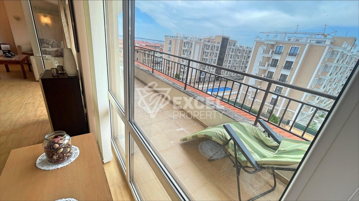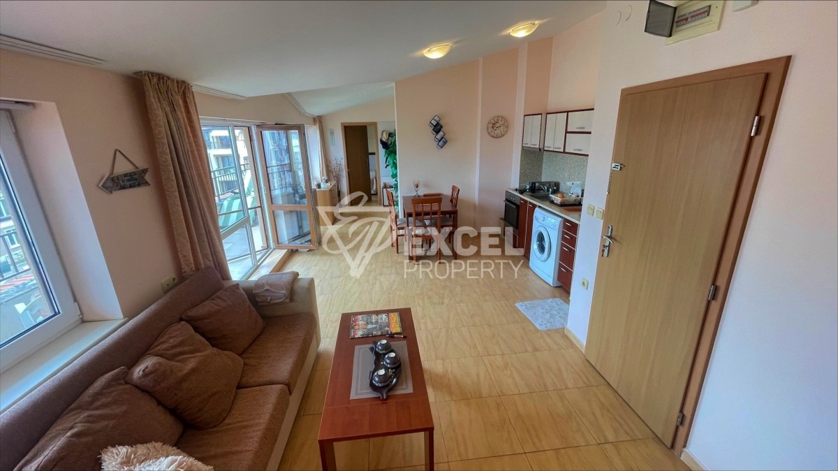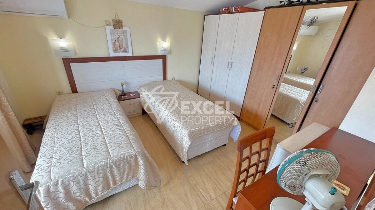 The property is located on the top, fifth floor, has an eastern exposure and a view of the sea and the pool of the complex. It has a living area of 82 sq.m. and is offered fully furnished. It consists of a living room with a comfortable kitchen, bedroom, a bathroom and a large terrace. The living room its equipped with a sofa bed and an armchair, a chest of drawers, a TV cabinet with a TV, a coffee table and a dining table with four chairs. The kitchen is equipped with an oven with hotplates, an extractor fan, a fridge, a washing machine, a microwave and enough cupboards for crockery. In the bedroom you will find two single beds with bedside tables, a dressing table and a large wardrobe. The balcony is accessible from both rooms and is large enough to accommodate a table with chairs and two sun beds. From there there is a panoramic view of the sea and the pool. The apartment has two air conditioners, cable TV and internet. The bathroom has a bathtub. The property is fully equipped and can be used for your summer holidays or for rent. Maintenance fee 750 Euro/year.