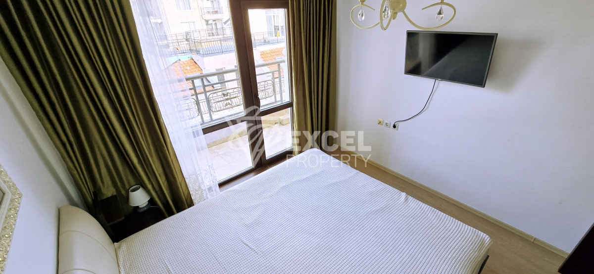 Excel Property offers for sale a one bedroom apartment in Raduga complex. The property is bright and sunny, located on the sixth floor and has a total area of 53 sq.m. It is offered furnished and fully equipped. It consists of a small entrance hall a spacious living room, a bedroom, a bathroom and a large balcony. The furniture includes a corner sofa, a dining table with four chairs, a large kitchen with all electrical appliances, including a small dishwasher. In the bedroom you will find a double bed, with bedside tables, a wardrobe and a TV. The bathroom has a shower cabin, one air conditioner is available in the living room. The terrace is of a large size with access from both rooms, the exposition is north and has a view of the mountains. The property offers an excellent opportunity for rental or year-round use. It can comfortably accommodate up to four people. The complex has ACT 16, the maintenance fee is 450 Euro/year.