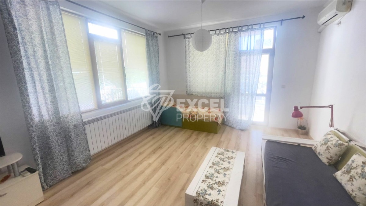 Excel Property offers for sale an apartment for sale in Black Sea district, Nessebar. The property is a one bedroom apartment on the ground floor with a total area of 75 sq.m. It is offered for sale fully furnished and has an entrance hall, a living room with a kitchen, a bathroom with a shower cabin and a bedroom. The kitchen is equipped with stoves, an extractor hood and a mini fridge. In the living room there is a coffee table, a dining table with three chairs and a TV cabinet with a TV, an air conditioner and a children's bed. The apartment has direct access from the courtyard of the building and a small veranda can be set aside in front of it.