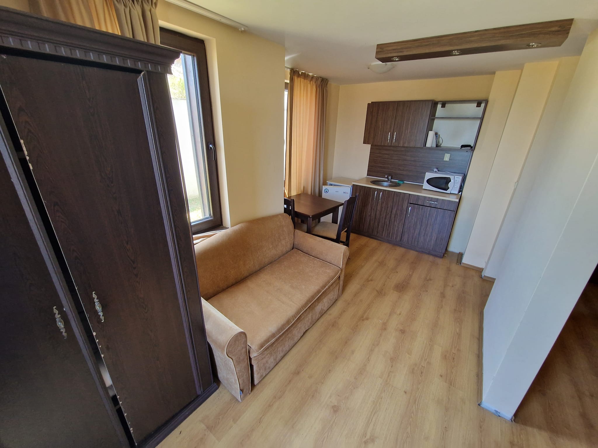 The apartment has an area of 51.38 sq.m., facing southwest and with a wonderful panoramic view of the city of Bansko and Pirin. Located on the ground floor and equipped with telephone, cable TV and Internet. The rooms are finished with walls - latex, floors - laminate and terracotta and PVC joinery. Distribution of the premises: entrance hall, living room with kitchenette and sleeping area and one bathroom and bathroom. In winter, the complex is a favorite destination for skiers and offers good service, ski storage and transport, regularly transporting to the lift and back.