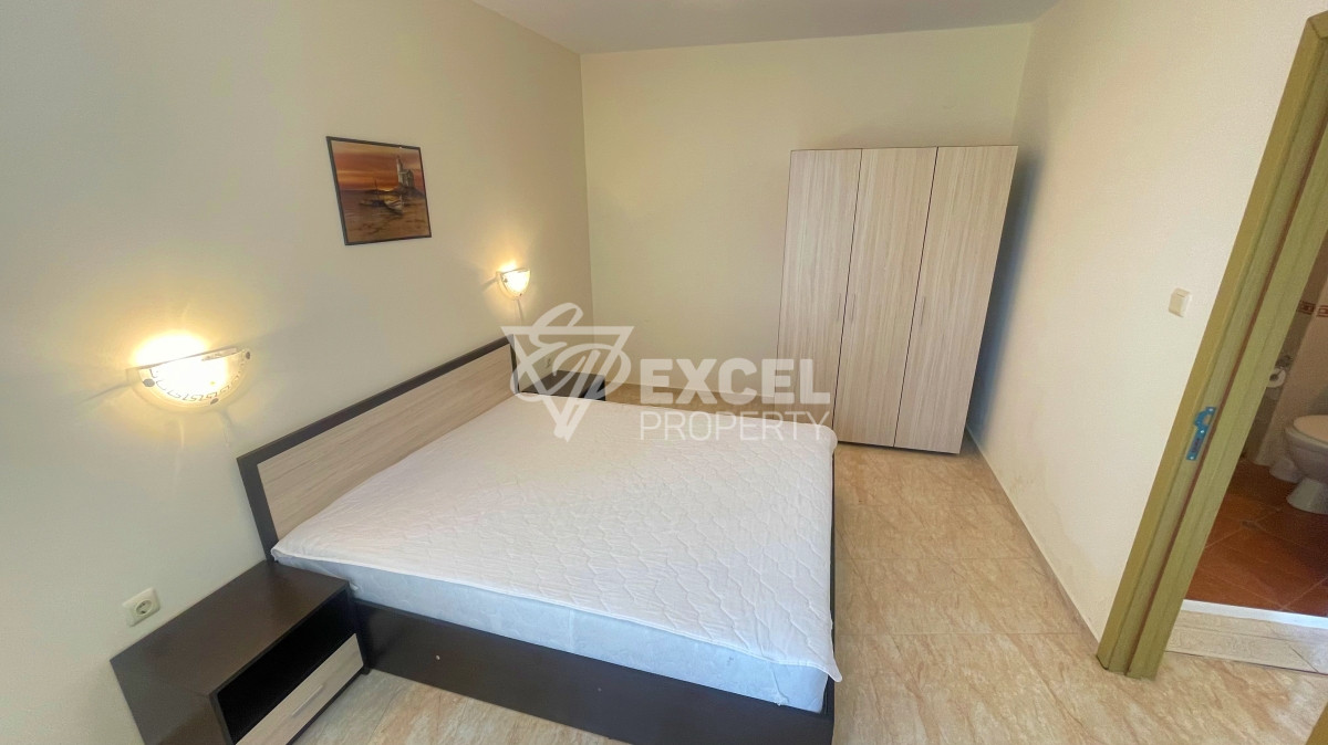 Excel Property offers for sale a one bedroom apartment in the Sunny Beach Hills complex. The property is bright and sunny, located on the fourth floor and has a total area of 63 sq.m. It is offered for sale fully furnished and has a living room with a kitchenette, a bedroom, a bathroom and a balcony. The kitchen is equipped with stoves, a refrigerator and a washing machine. The living room is furnished with a sofa bed, a dining table with four chairs and a TV set. In the bedroom you will find a double bed with bedside tables, a wardrobe and a dressing table. The bathroom has a shower cabin, one air conditioner is available. The terrace is with good size, accessible from both rooms and west facing. The property provides an excellent rental opportunity. It has been used very little and is in excellent condition and is ready to welcome its new owners.