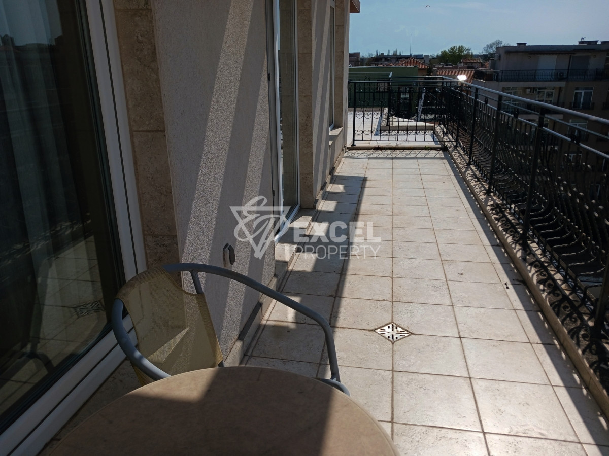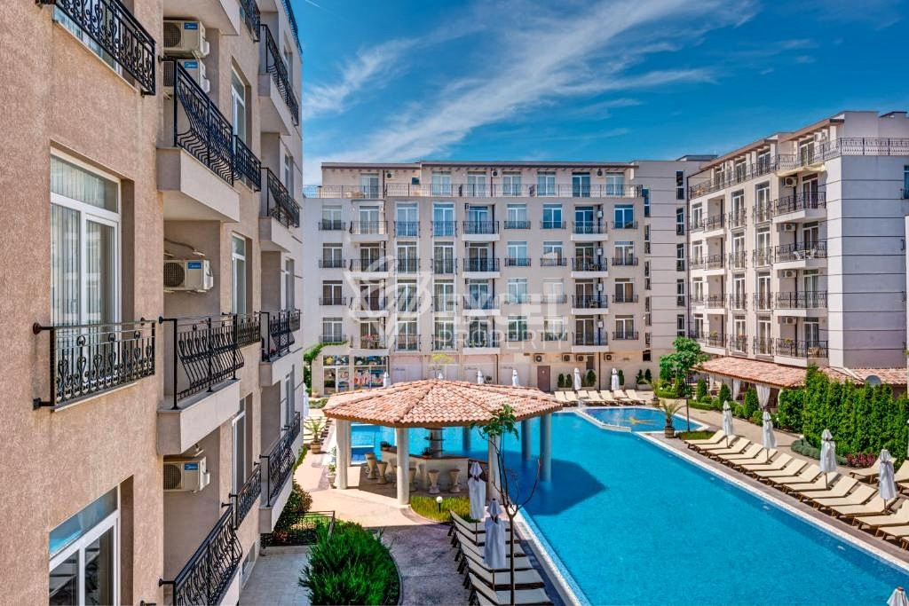 We offer for sale without commission from the buyer a fully furnished and equipped one-bedroom apartment, located on the sixth floor in the Dаwn Park complex. The apartment consists of a living room with sofas, a TV, one air conditioner, a dining table with chairs, a kitchenette equipped with an electric stove, extractor hood, washing machine, refrigerator and microwave, there is a bathroom with a shower cabin and toilet; a separate bedroom with two beds, a wardrobe and a large terrace with an exit from the living room, overlooking the complex's swimming pool. Living area of the property: 47.04 sq.m., common areas: 6.12 sq.m., total area: 53.16 sq.m. Annual maintenance fee for this property - 1,090 Euro, annual repair fund fee - 50.90 Euro.
