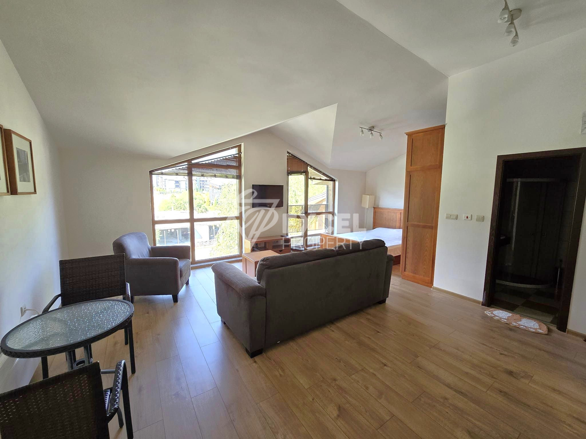 Просторно, обзаведено студио с фронтална гледка към Пирин за продажба в Green Wood, район Разлог! Целогодишно работещ Апартхотел със СПА център и басейни! Отделни партиди за ток и вода!