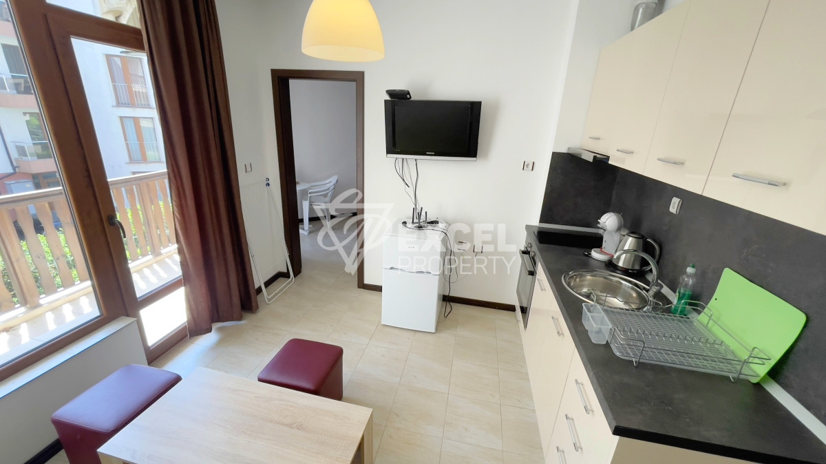 Excel Property offers for sale a one-bedroom apartment for year-round use in Sveti Vlas. The property is located in Shipka complex, just 200 meters from the beach. The apartment is on the fourth floor and has a total area of 45 sq m. The space is divided between an entrance hall, a small living room with a kitchenette, a bedroom, a bathroom and a balcony. The furniture includes a sofa bed, a coffee table and a kitchen with all appliances such as an oven, hob, refrigerator and extractor hood. In the bedroom you will find a double bed with bedside tables, a wardrobe and a chest of drawers. The balcony is accessible from both rooms, has a table and two chairs, has a view of the neighboring complex and is south facing. There are two air conditioners and a TV in the living room, it is ready for renting or for use by the new owners. The building is intended for year-round use, the elevator works in winter. The complex has AKT 16 and has a swimming pool and an area for sun loungers and umbrellas. The maintenance fee is 10 Euro/m2.